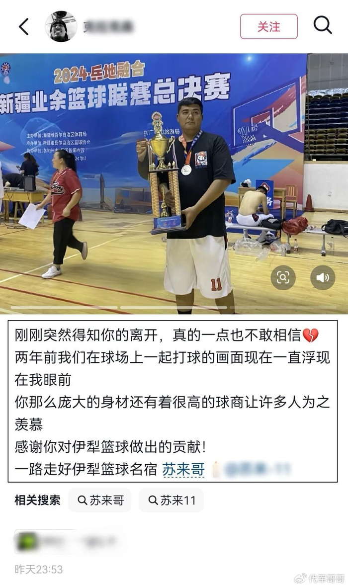 这一消息迅速在新疆篮球圈传开,曾与他同场竞技的球员、执教过的弟子纷纷表示难以置信,昔日队友阿力木在社交平台发文:"还记得去年联赛夺冠后,你说要带我们冲击全疆冠军,怎么就食言了…… 每次训练你都冲在最前面,累了就靠在替补席眯一会儿,从来不说苦,你怎么就这么突然离开了"。网友们也在社交平台留言哀悼,有人回忆 "上个月还在球馆见过他指导孩子训练,壮实的身影、温和的语气,怎么说没就没了",更多人感叹 "天妒英才,这么好的教练太可惜了"。